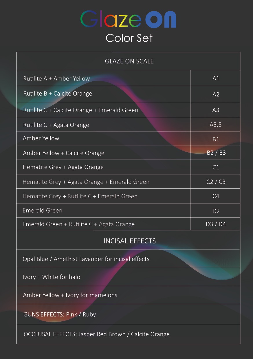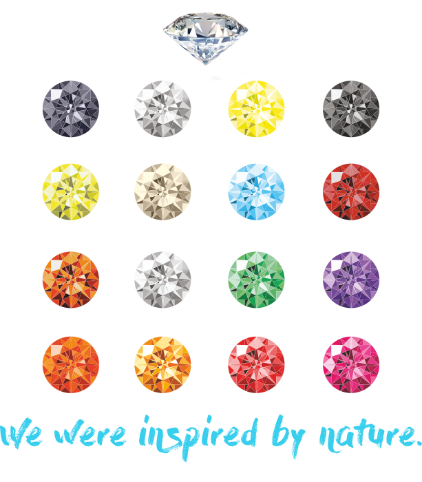Amethist Lavender, Calcite Orange, Rhodonite Pink, Rutilite A, Rutilite B, Rutilite C, Ivory, Clear, Diamond Clear, Amber Yellow, Agate Orange, Ruby Red, Jasper Red Brown, Opal Blue, Emerald Green, Hematite Grey, White